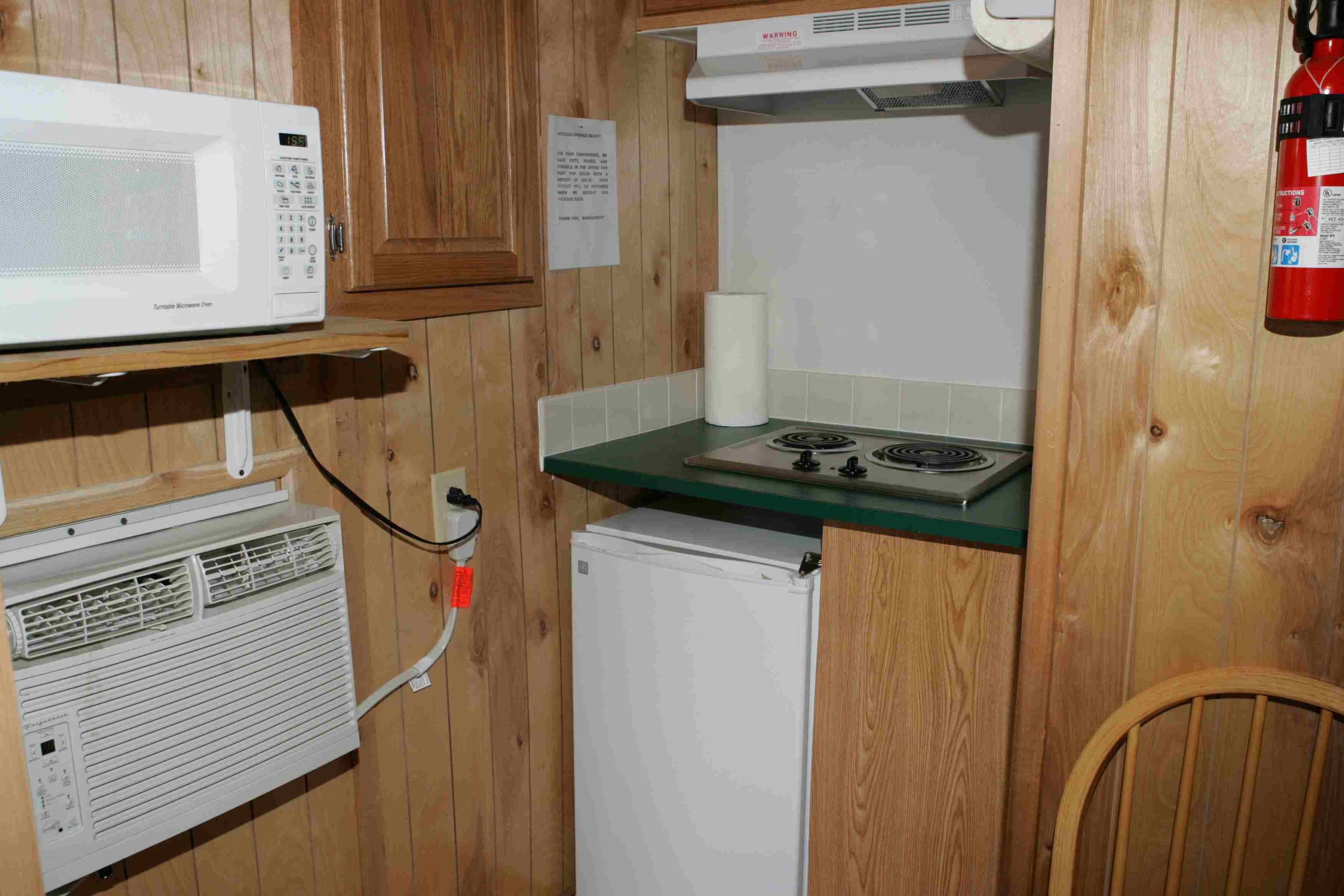 Features: Beachfront Cabin with porch, a Kitchenette, a Full Size Futon with a twin top, and bathroom with a shower stall.