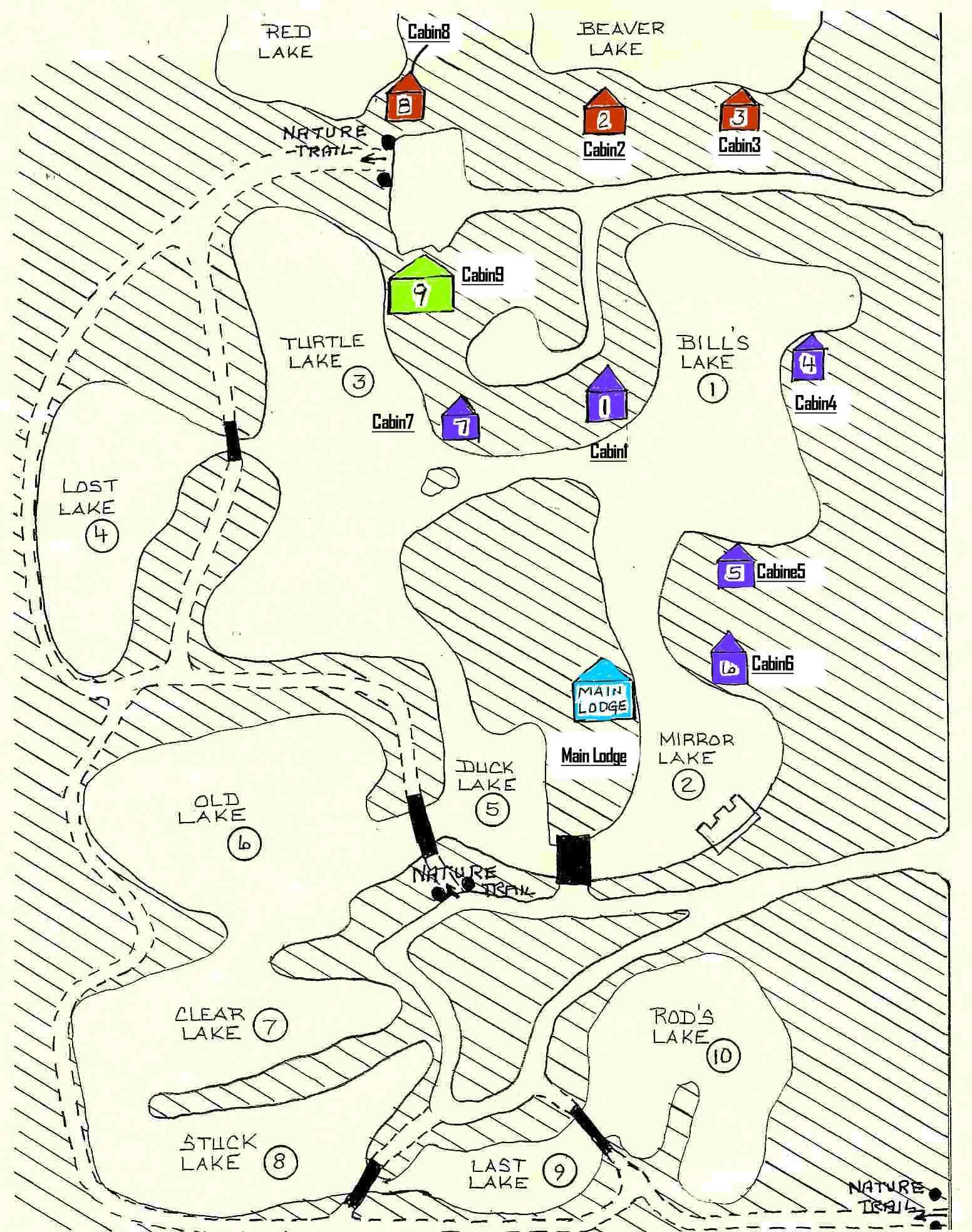 Look below for the location of your cabin. If you are deciding on Cabins 11, 12, 13, 15, 17, 18, & 19 you will need to look in the RV Camping Link. These cabins are along side the Swimming Lake. The Front Porch of 15 thru 19 are facing the swimming beach.