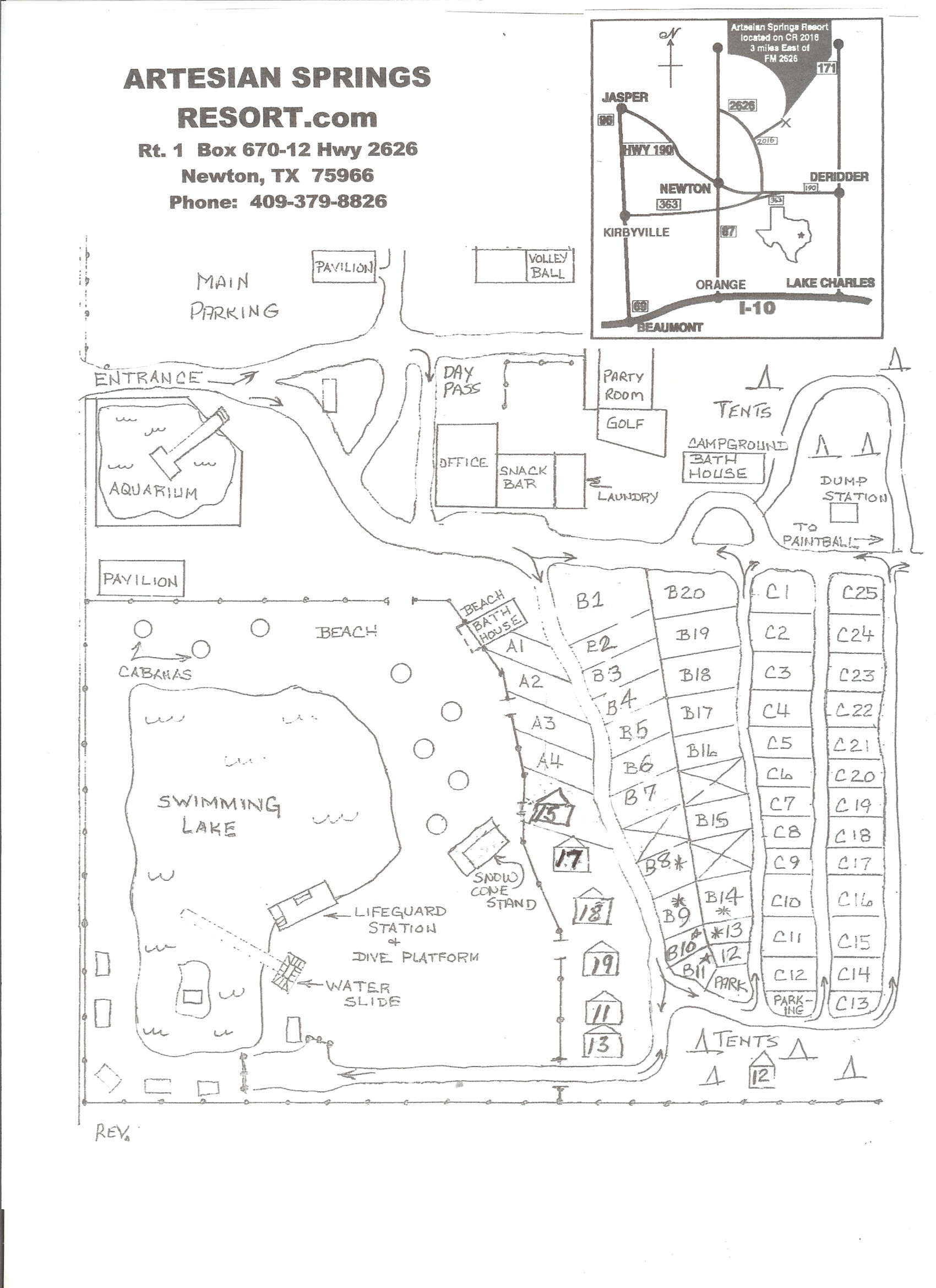 RV Sites If you are going to arrive after closing hours, you need to call and let us know so we can provide a map with your location in our mail box. You can settle your bill with us the following morning. Sorry, we do not honor any discounts or special promotions during our summer season. Artesian Springs Resort is a unique RV Resort nestled in the Texas piney woods, dotted with acres and acres of lakes connected by channels for your boating experience. We have over 50 shady, level, full-service RV sites that can accommodate any length or size RV�s, even double sided with pull thru sites. Stay a day, a weekend, a week or a month in our campgrounds or cabins.